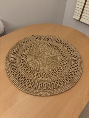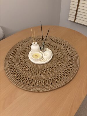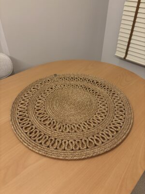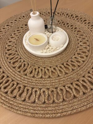 – 60×60 cm boyutlarındaki yuvarlak tasarımı ile her türlü masa düzenine uyum sağlar ve şık bir görünüm sunar.; – Türkiye’de üretilmiş olup, yerel işçilikle özenle hazırlanmıştır.; – Kolay temizlenebilir yapısı sayesinde nemli bir bezle silinerek pratik bir şekilde temizlenebilir.; – Polipropilen materyali ile dayanıklılık ve uzun ömürlü kullanım vaat eder.; Hasır, Jüt Görünümüyle bohem bir hava katar