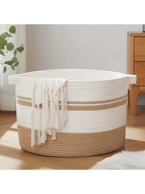 Hiçbir kimyasal ve zararlı madde içermeyen %100 pamuklu ipten dokuma sepetlerimiz aileniz ve evcil hayvanlarınız için güvenlidir; Şekillerini iyi tutacak kadar sağlam, yükseltilmiş kaliteli ipten üretilmiştir yıllarca kopmaz; Keskin veya sert kenarlar yoktur, bu nedenle cildinizi veya zemini çizmez; S aklama sepetimiz 35×55 cm boyutlarındadır, mükemmel bir bebek bezi düzenleyicisi, kreş kutusu, oyuncak deposu, bebek bezi sepeti ve hatta dolap organizasyonu için olabilir, banyo veya çamaşır odası depolama ve oturma odalarında kitap ve oyunları saklamak için, battaniye, dergi, havlu, çocuk oyuncakları diğer tekstilleri tutmak için harika bir sepet; Çekici beyaz ve kahverengi renkleriyle gelen büyük saklama sepetlerimiz, sadece saklama sepetleri olarak değil, aynı zamanda evinize eşsiz bir dekor eki olarak işlev görecektir; Sofistike şekilleri ve nötr renkleri sayesinde her türlü ev dekoruyla kusursuz bir uyum sağlar; aynı zamanda arkadaşlarınız ve aileniz için doğum günleri, yeni eve taşınma partisi, Noel veya diğer hediye verme etkinlikleri için pratik bir hediye olur; ;;