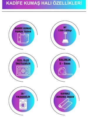 • Toz leke tutmaz, kolay temizlenir. ; •. ; • Tüy Çıkarmaz. ; • Anti-Alerjiktir. ; • Anti-Bakteriyeldir. ; • Su iticilik özelliği sayesinde lekeler kolaylıkla çıkar. ; • Taban Kaydırmaz A kalite pamuk tabandır• Uygun ebatlar çamaşır makinesinde düşük ısıda 30 derecede yıkanabilir. ; • Çamaşır suyu ve ağartıcı kullanmayınız. ; • Kurutucuda kurutulmaz. ; • Kuru Temizleme yapılamaz. ; • Sıkmadan asarak kurutunuz. ; • Doğrudan güneş ışığına maruz bırakmayınız.;