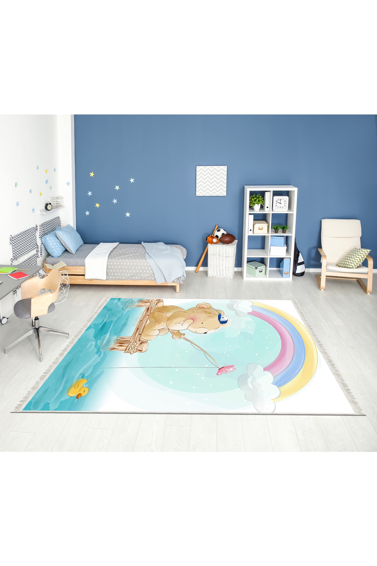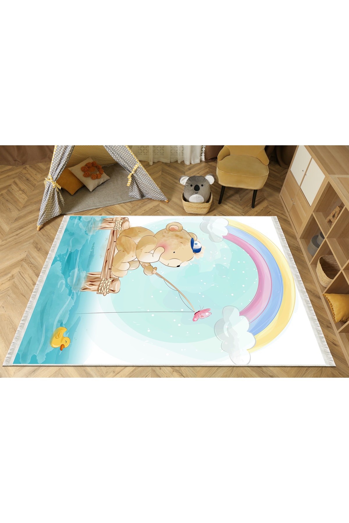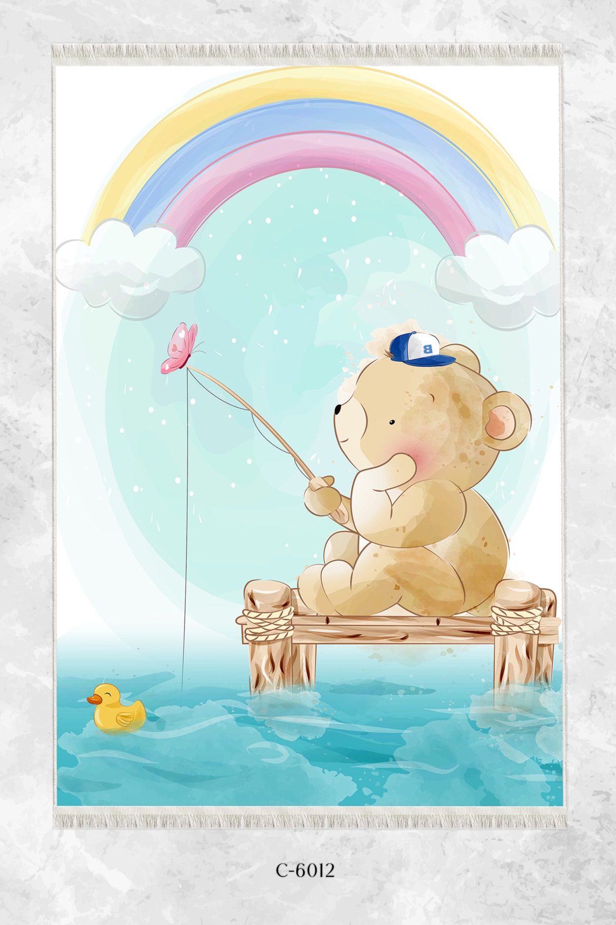 Dijital Baskı Kaymaz Taban Makinede Yıkanabilir Balık Tutan Ayıcık Desenli Çocuk Odası Halısı