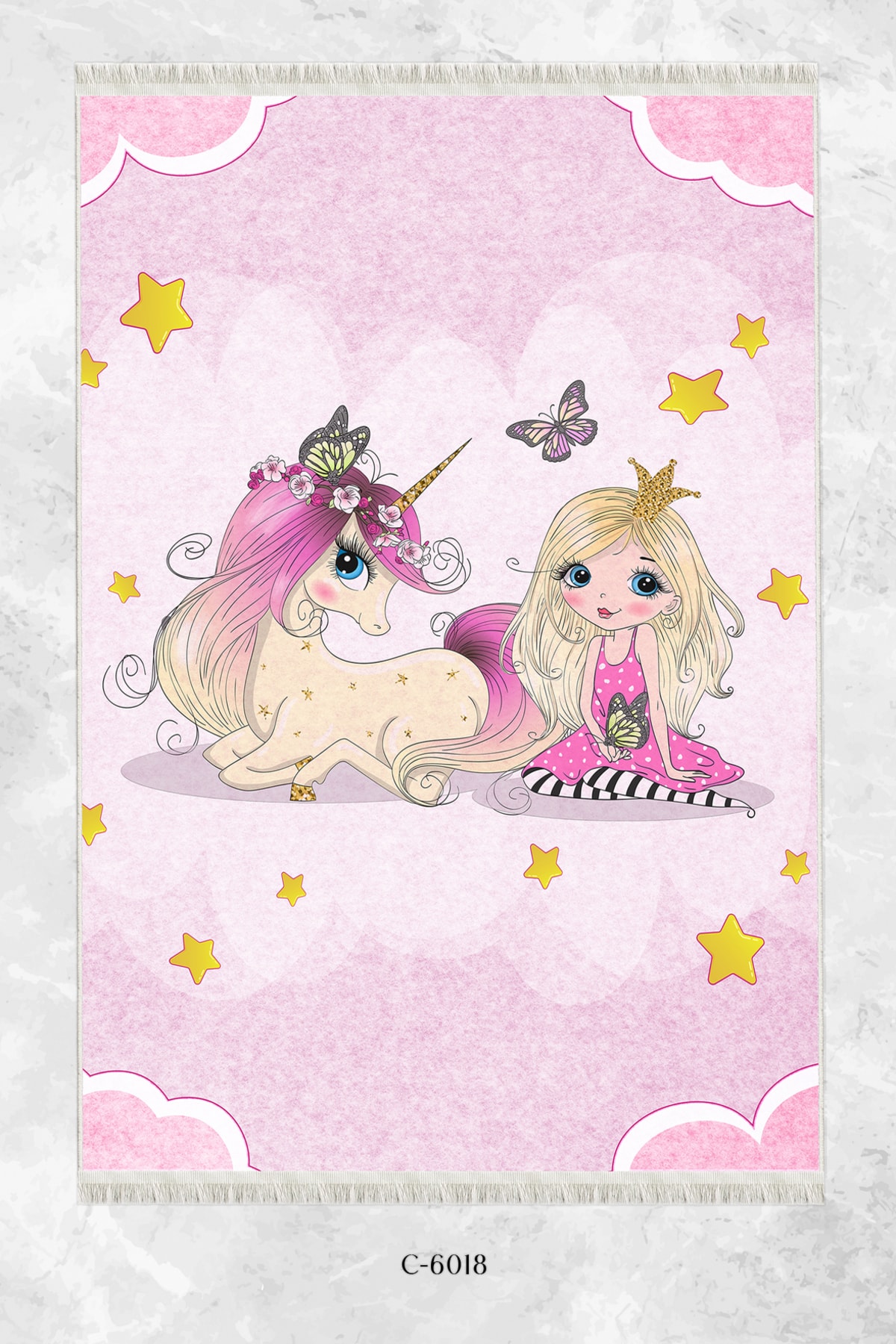 Dijital Baskı Kaymaz Taban Makinede Yıkanabilir Unicorn Desenli Çocuk Odası Halısı