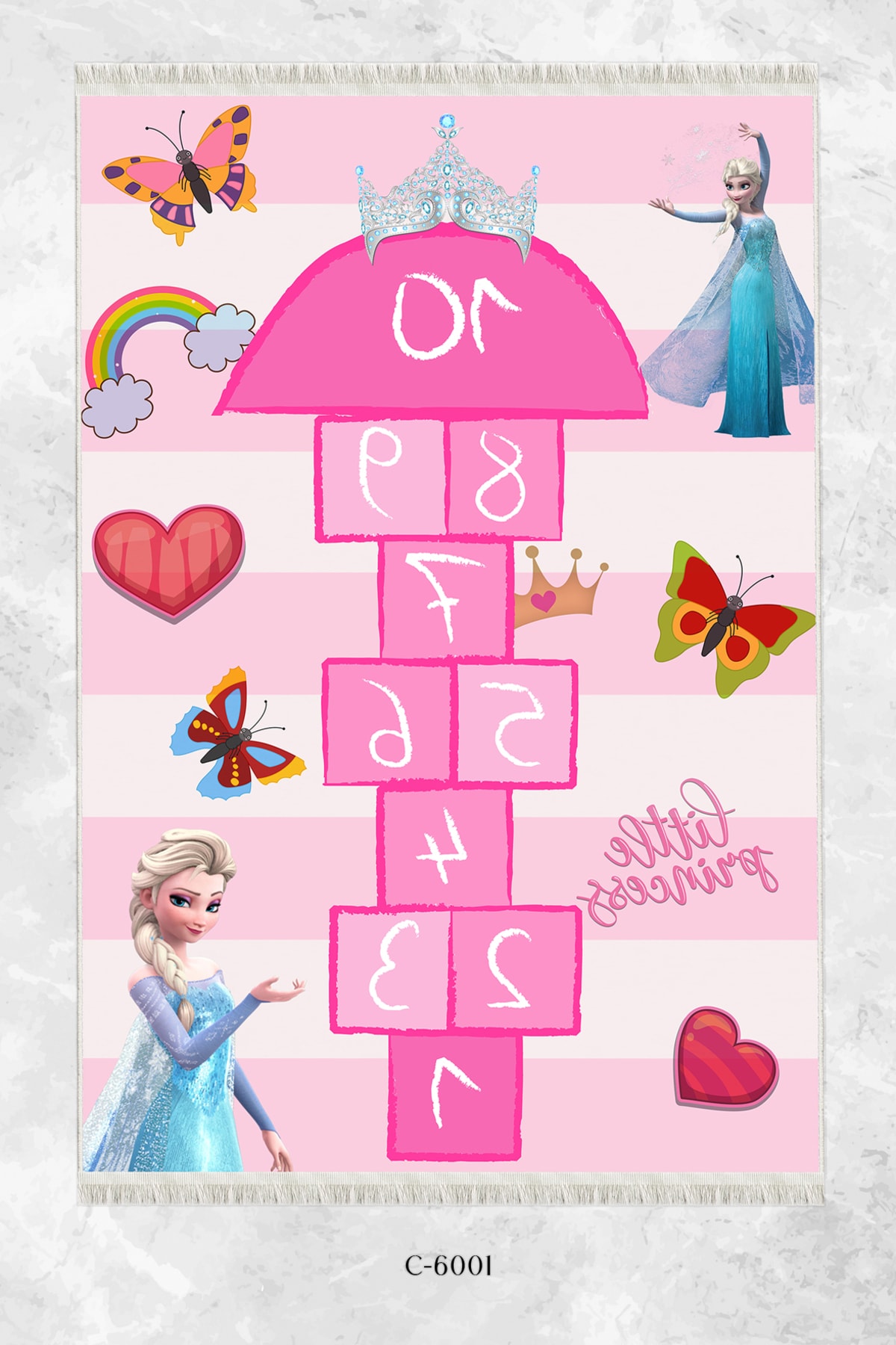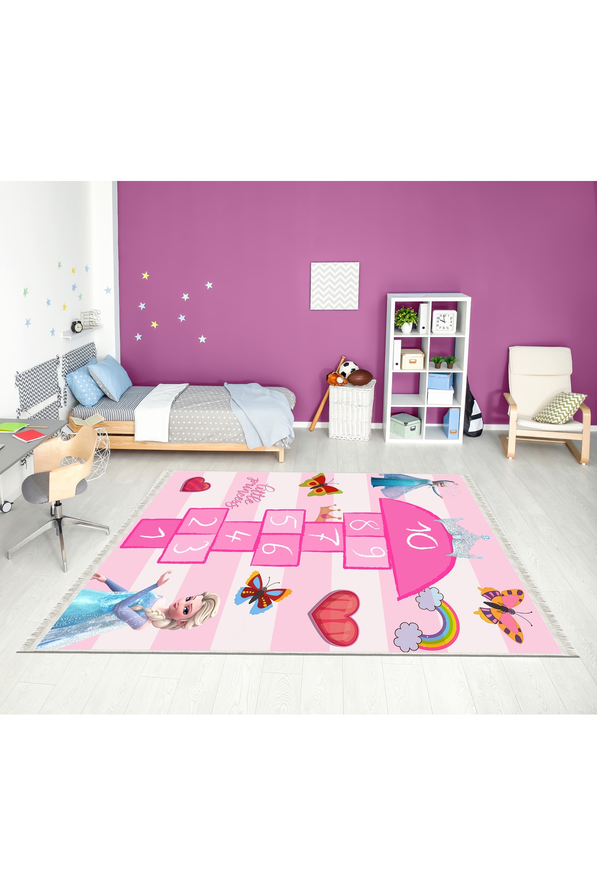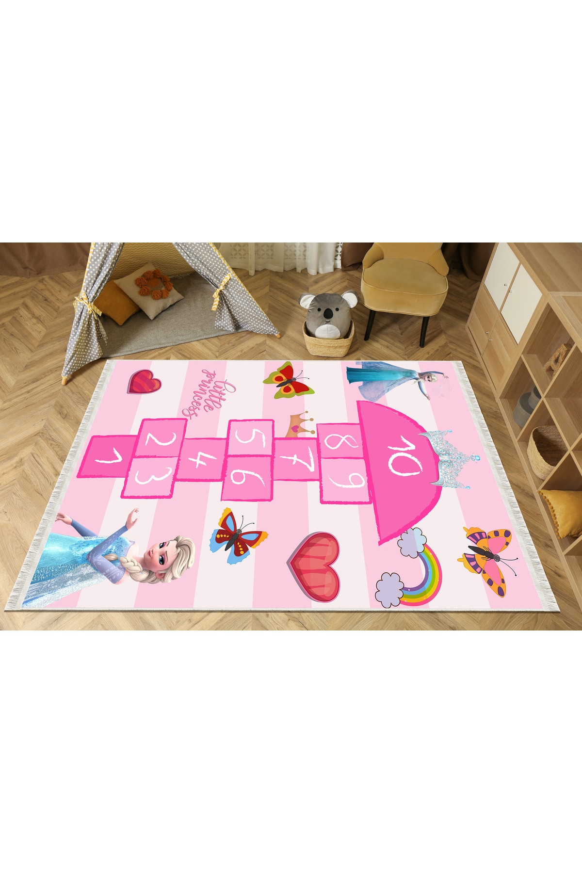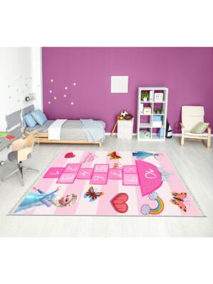 Dijital Baskı Pamuk Taban Makinede Yıkanabilir Pembe Gökkuşağı Seksek Desenli Çocuk Odası Halısı