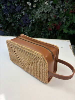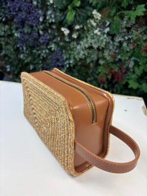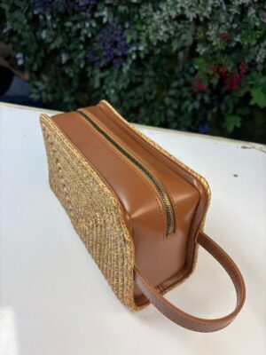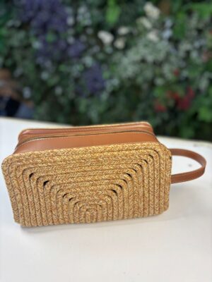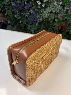 Doğallığın zarafetle buluştuğu bu makyaj çantası, özel dokuma tekniğiyle hazırlanmış eşsiz hasır yüzeyi ve yumuşak deri detaylarıyla hem şıklığı hem de dayanıklılığı bir arada sunuyor. Kompakt tasarımı sayesinde çantanızda kolayca taşınabilir, geniş iç hacmiyle ise tüm makyaj malzemelerinizi düzenli şekilde saklamanıza olanak tanır. Altın tonlarındaki hasır dokusu, sıcak kahve rengi deriyle kusursuz bir uyum yakalayarak zamansız bir stil oluşturur. Hem günlük kullanım hem de seyahatleriniz için ideal bir seçimdir.